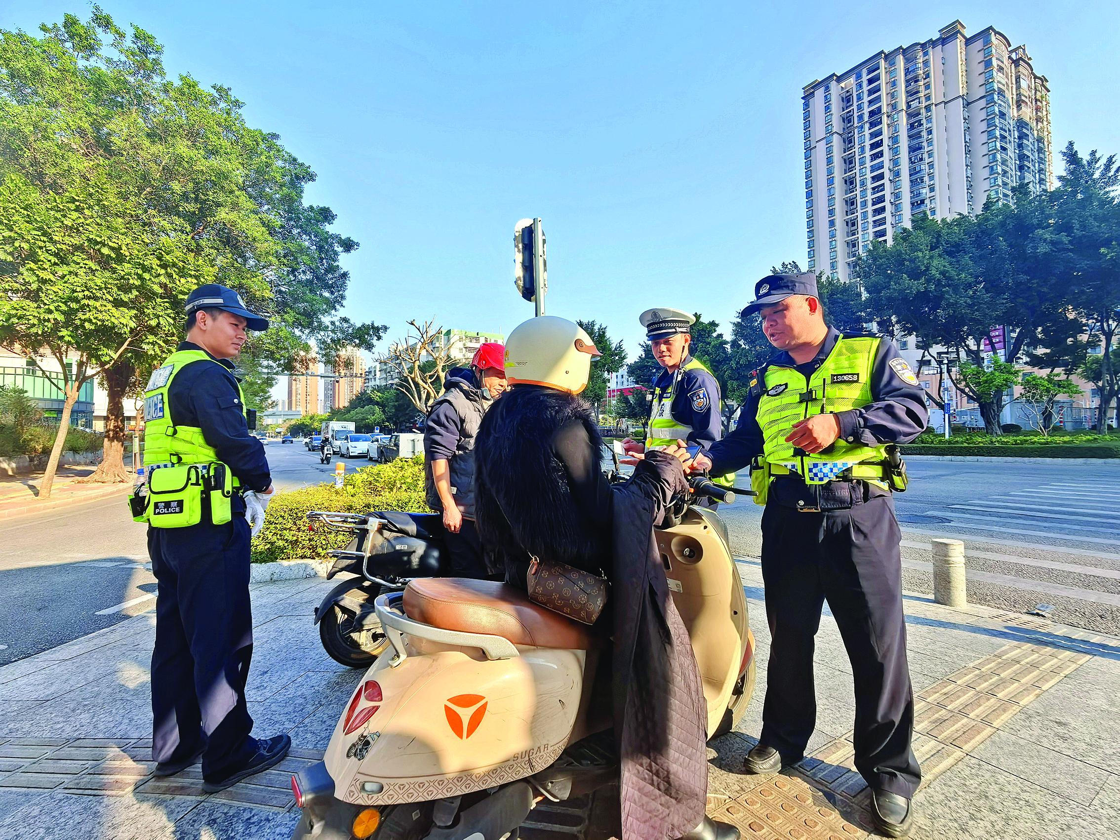 當(dāng)天早晚高峰期,惠州交警組織警力前往全市60個重要路段路口,采取“查處+教育”模式,對電動自行車摩托車突出交通違法行為嚴(yán)查嚴(yán)管的同時,面向市民群眾普及“早點走、靠右行、慢慢開”安全騎行理念,引導(dǎo)大家養(yǎng)成良好的交通習(xí)慣。