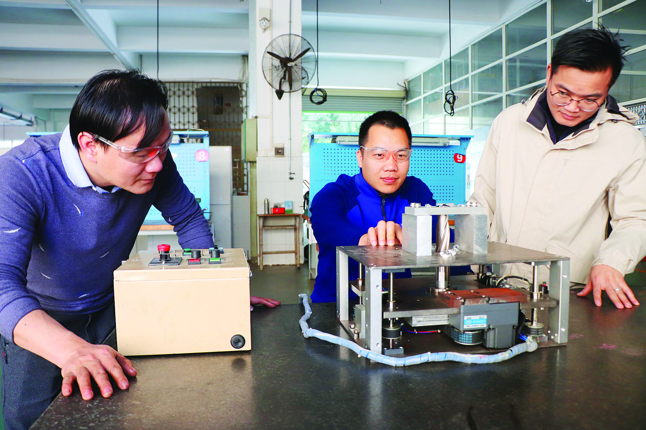 消防裝備技師張昌深(中)演示汽車電池滅火裝置二代設(shè)備如何“穿刺”。