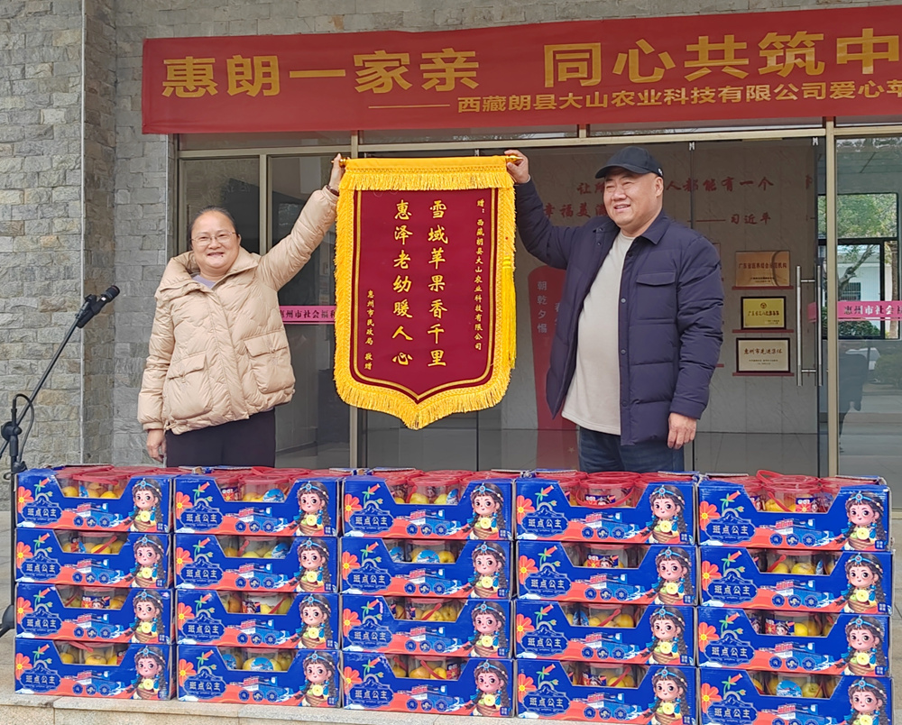 楊威表示,捐贈的1448箱帶著雪域高原純凈氣息的蘋果,承載著朗縣人民對惠州親人的深厚情誼,能為“一老一小”送去關懷,是企業(yè)的榮幸與責任。此次捐贈活動的成功舉辦,離不開廣東省第十一批援藏工作隊朗縣工作組的傾情牽線與全力對接。廣東省第十一批援藏工作隊朗縣工作組組長、惠州市政府副秘書長、朗縣縣委常務副書記、常務副縣長黃其蔚深情回顧了粵藏兩地、惠朗之間的深厚情誼。他表示,廣東省第十一批援藏工作隊朗縣工作組始終致力于搭建兩地交流的橋梁,此次愛心蘋果捐贈正是援藏工作中“民心相通”的生動實踐,讓山海相隔的惠朗兩地心貼得更近、情連得更緊。