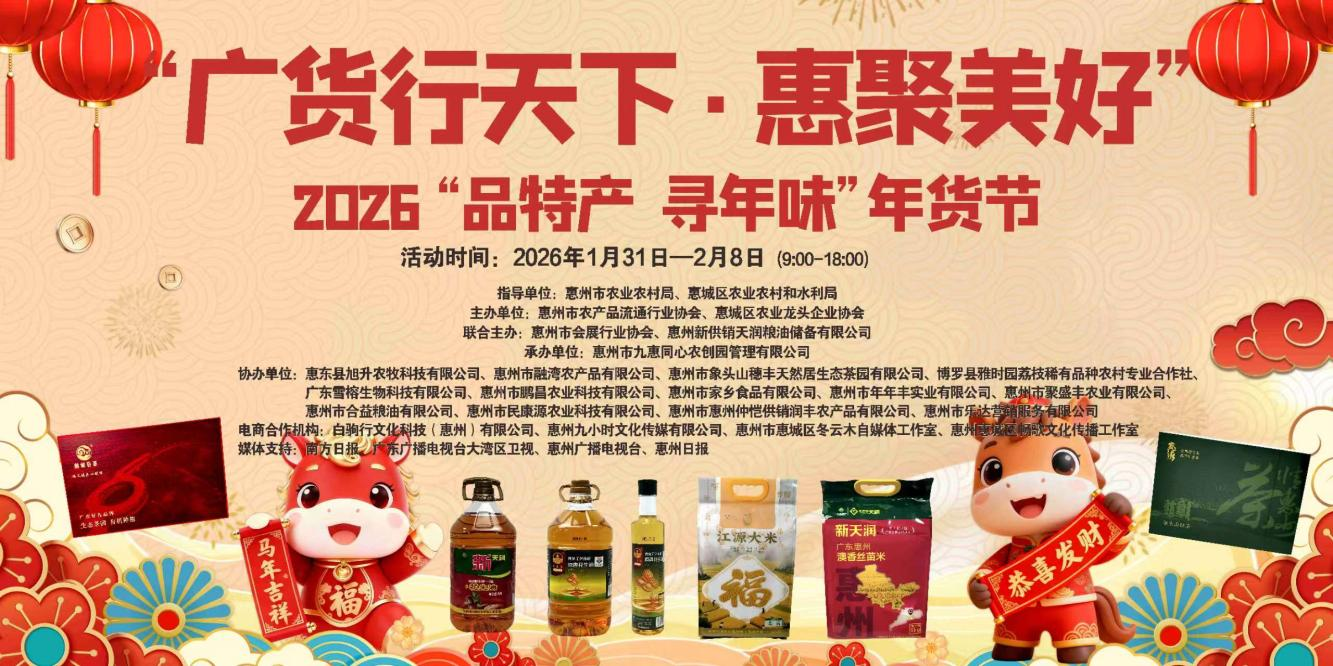 為響應(yīng)農(nóng)業(yè)農(nóng)村部“品特產(chǎn)·尋年味”消費(fèi)促進(jìn)活動(dòng)及廣東省“廣貨行天下”春季行動(dòng)部署,一場(chǎng)兼具煙火氣、文化味與公益性的新春年貨盛宴即將啟幕——惠州市農(nóng)業(yè)農(nóng)村局協(xié)同市商務(wù)局、惠州日?qǐng)?bào)社、各相關(guān)縣區(qū)及行業(yè)協(xié)會(huì),于1月28日至2月15日,推出“廣貨行天下·惠聚美好”新春年貨節(jié)系列活動(dòng),以四站聯(lián)動(dòng)、線上線下融合的方式,集中亮出惠州特色農(nóng)產(chǎn)品“家底”,讓市民游客輕松囤好物、暖迎馬年新春。