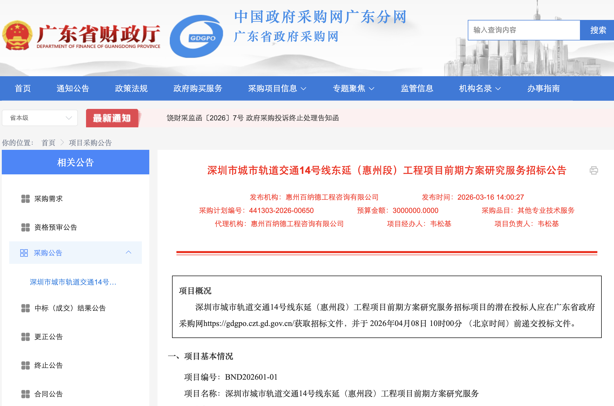 根據(jù)廣東省政府采購網(wǎng)發(fā)布的《深圳市城市軌道交通14號線東延(惠州段)工程項目前期方案研究服務(wù)招標公告》,該項目的采購方式為公開招標,采購包預(yù)算金額為300萬元,投標人應(yīng)在廣東省政府采購網(wǎng)獲取招標文件,并于2026年4月8日10時前遞交投標文件。該項目采購人信息為惠州市惠陽區(qū)交通運輸局。