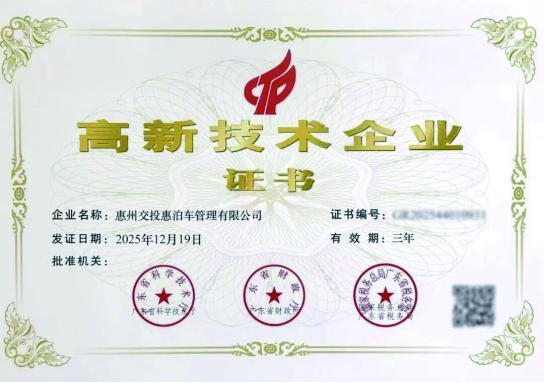 惠州交投惠泊車管理有限公司獲“高新技術(shù)企業(yè)”認(rèn)定