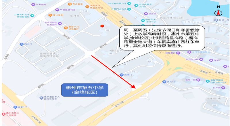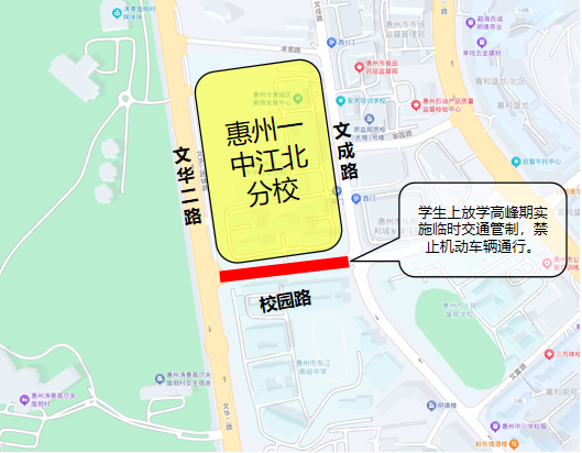 其中,周一至周五(法定節(jié)假日和寒暑假除外)放學高峰時段11:50—12:30、17:00—18:00,惠州市第一中學江北分校南側校園路(文華二路至文成路段)禁止機動車通行(救護車等車輛除外),其他時段保持雙向通行。