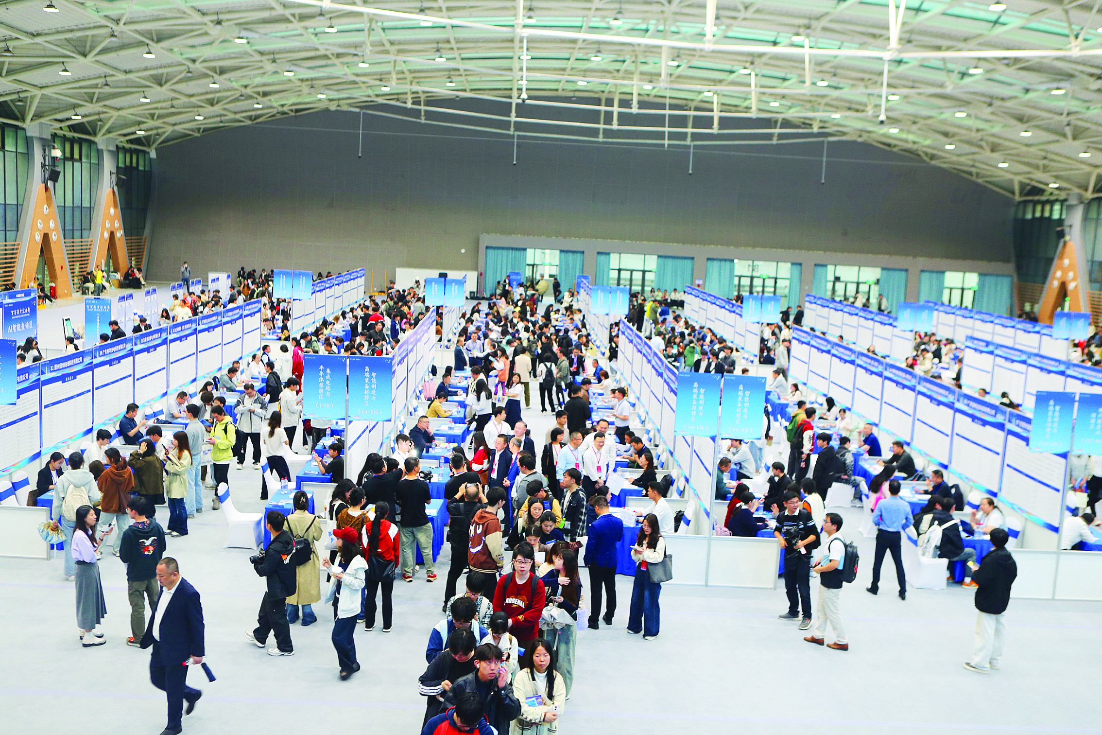 這份松弛,背后是細(xì)致的安排。招聘區(qū)按五大板塊清晰分區(qū):電子信息與半導(dǎo)體/集成電路、新能源與新材料、智能制造與高端裝備、現(xiàn)代服務(wù)業(yè)、實(shí)習(xí)崗位/企業(yè)代招,企業(yè)與學(xué)子精準(zhǔn)對(duì)接。