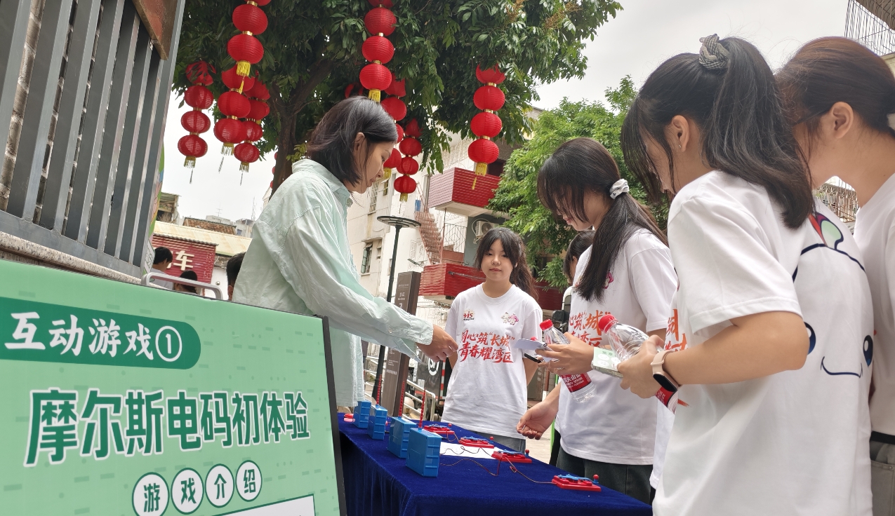 旅店外,長(zhǎng)城行展覽、互動(dòng)游戲等活動(dòng)同樣引人入勝。互動(dòng)游戲設(shè)置了摩爾斯電碼初體驗(yàn)、東湖旅店復(fù)原拼圖、暗號(hào)匹配問(wèn)答題等環(huán)節(jié),吸引了青年學(xué)子們輪番上陣體驗(yàn),增強(qiáng)對(duì)隱蔽戰(zhàn)線歷史和國(guó)家安全工作的了解。