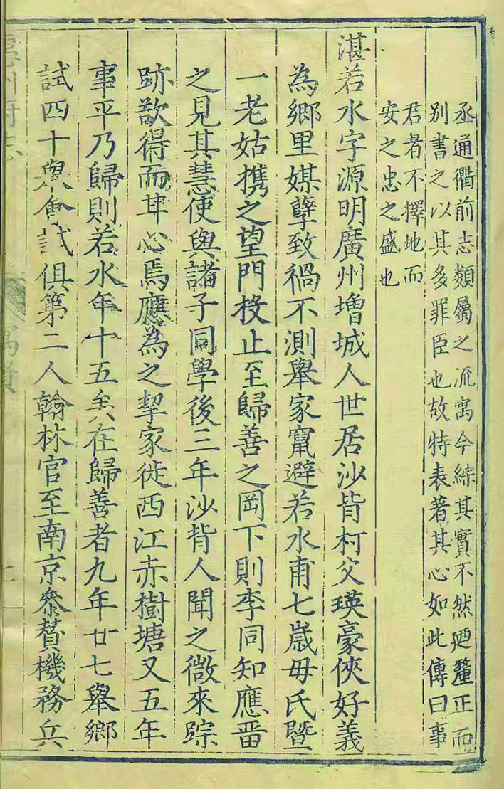 關(guān)于湛若水的童年經(jīng)歷,文獻(xiàn)中也有另一種說(shuō)法。比如明代蔣冕撰《明封太孺人陳氏墓志銘》謂,“怡庵公(湛若水父親)既蚤世,太孺人孀居于母家,餐糲衣故,惟切切以教子為務(wù)”。顧鼎臣撰《慈母?jìng)鳌芬嘀^,“家嘗中衰,怡庵又蚤世,孺人攜若水及諸女依母家以居,餐糲衣敝,日夜切切以訓(xùn)子為事”。蔣冕和顧鼎臣均未提及湛母帶著湛若水避難惠州之事,僅是“依母家以居”。然湛母卒于明正德十年(1515),距離避難惠州時(shí)已過(guò)去四十余年,后人撰記時(shí)對(duì)這段記憶恐早已模糊。