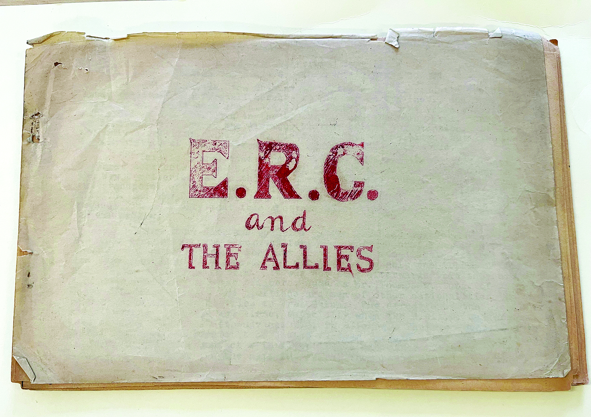 這是一本普通信紙大小、紙張泛黃發(fā)黑的筆記,封面用紅字寫著《東江縱隊(duì)與盟軍》。這份檔案未經(jīng)裝訂,只用別針夾著,頁(yè)邊已脆化。