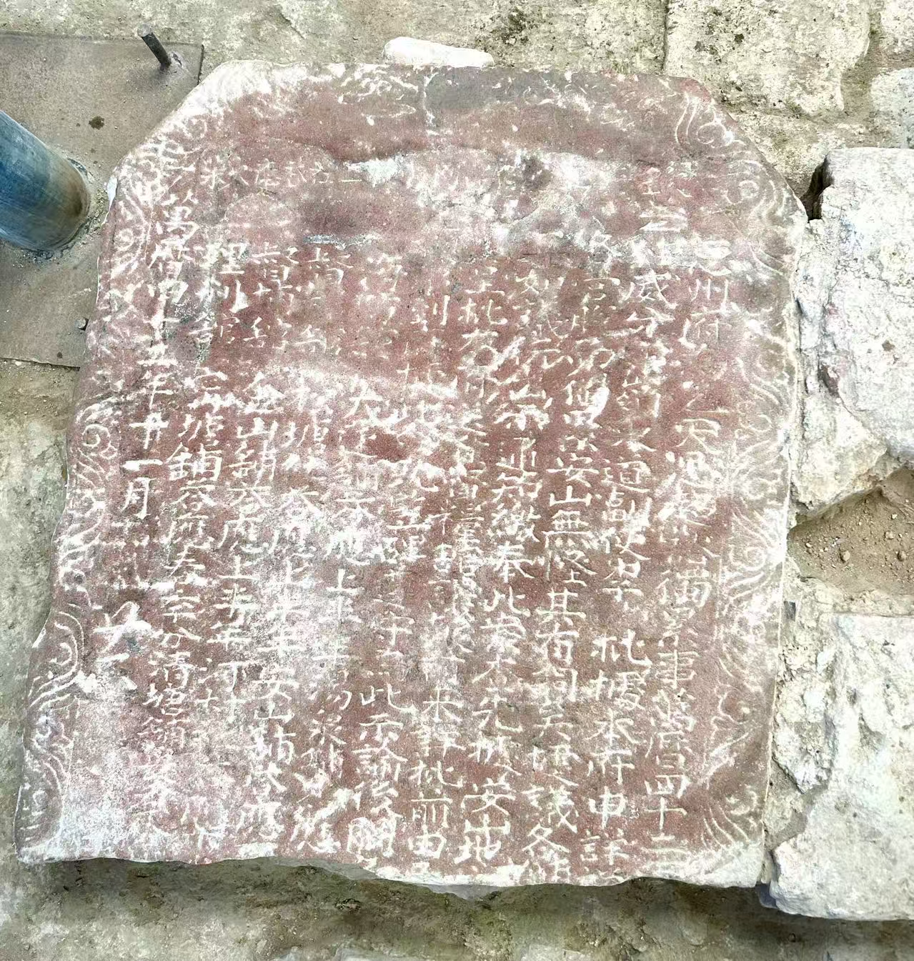 2022年8月,中山公園考古工作順利完成。此次工作完成發(fā)掘面積500平方米,清理建筑基址8座、井1口、排水溝5條、灰坑4個,出土一批磚、瓦、石等建筑構件和陶、瓷器等生活用具。而在所有發(fā)現(xiàn)中,最引人注目的“明星文物”,當屬在遺址中部現(xiàn)身的一通紅砂巖殘碑。盡管碑體已殘,但其上“萬歷四十二年”的字樣依然依稀可辨——像一句穿越四百多年的暗號,瞬間拉近了我們與明代的時空距離。