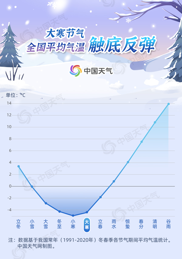 中國(guó)天氣網(wǎng)盤點(diǎn)1991年至2020年節(jié)氣大數(shù)據(jù)發(fā)現(xiàn),在小寒期間,全國(guó)平均氣溫跌到全年最低,僅有-5.1℃。而到了大寒節(jié)氣,氣溫開啟反彈之旅,比小寒上升0.6℃,達(dá)到-4.5℃。從全國(guó)平均氣溫而言,我國(guó)在小寒節(jié)氣達(dá)到最冷,大寒節(jié)氣雖然依舊天寒地凍、萬物蟄藏,但氣溫觸底反彈、生機(jī)潛伏,春天的腳步越來越近了。