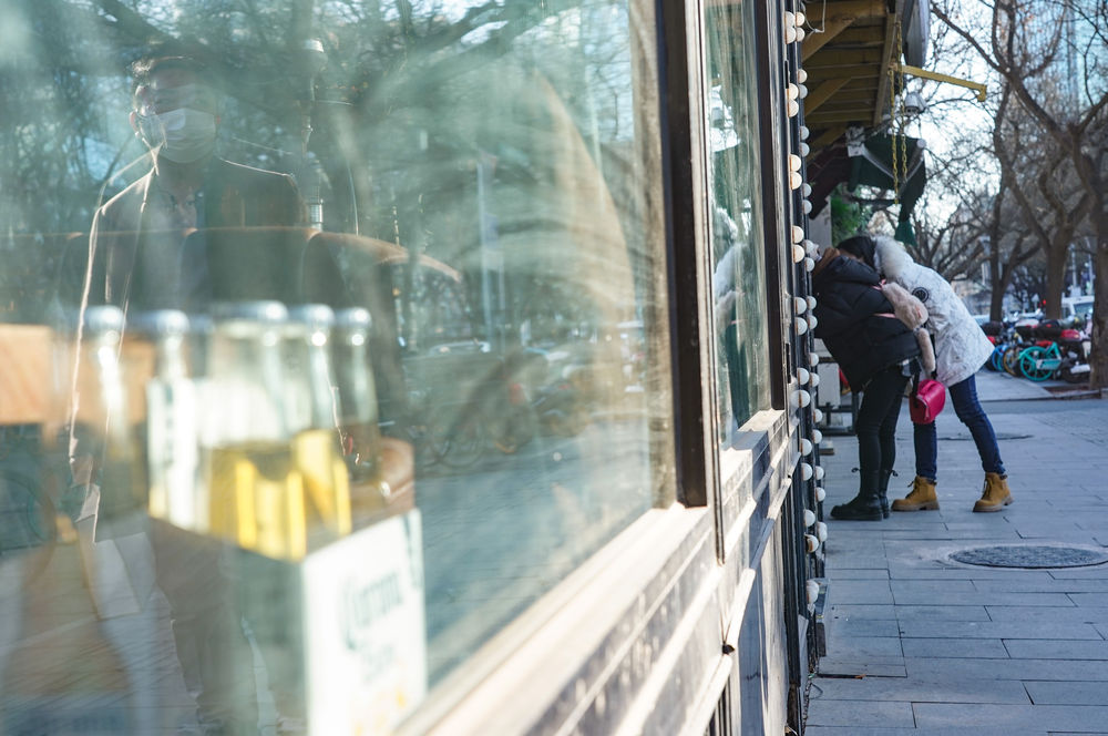 2月1日,在北京三里屯酒吧街,市民看向停業(yè)的酒吧店內(nèi)。新華社記者陳鐘昊 攝