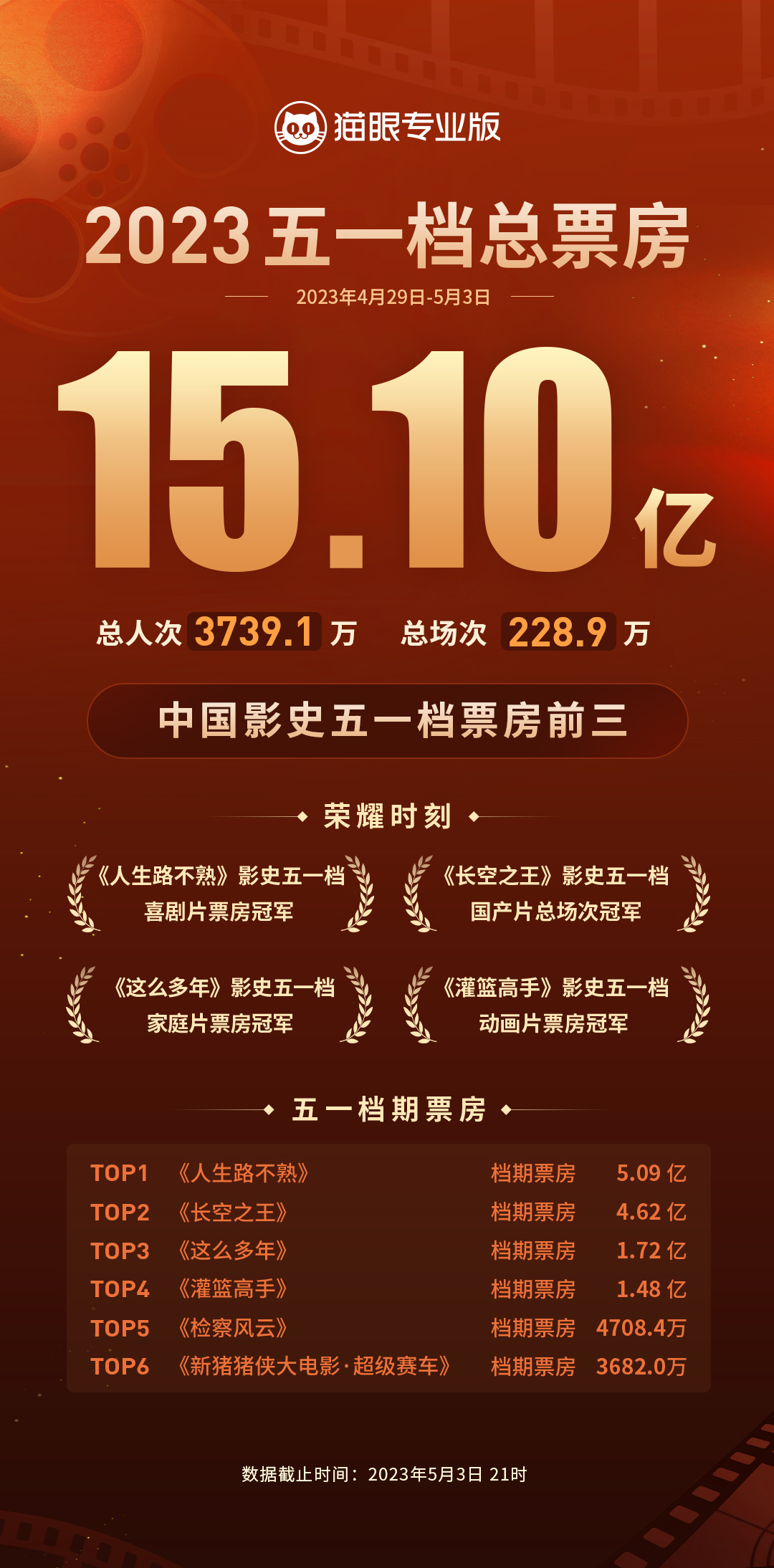 據(jù)貓眼專業(yè)版數(shù)據(jù),截至5月3日21時(shí),2023五一檔總票房15.10億元,進(jìn)入中國影史五一檔票房前三,數(shù)字僅次于2019年的15.27億元和2021年的16.73億元。今年五一檔觀影總?cè)舜?739.1萬,總場次228.9萬場,平均票價(jià)40元。