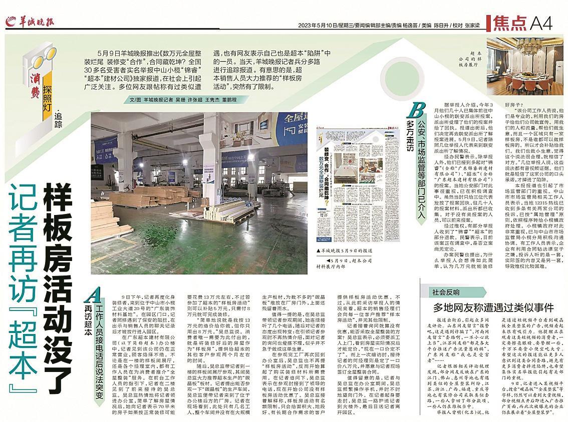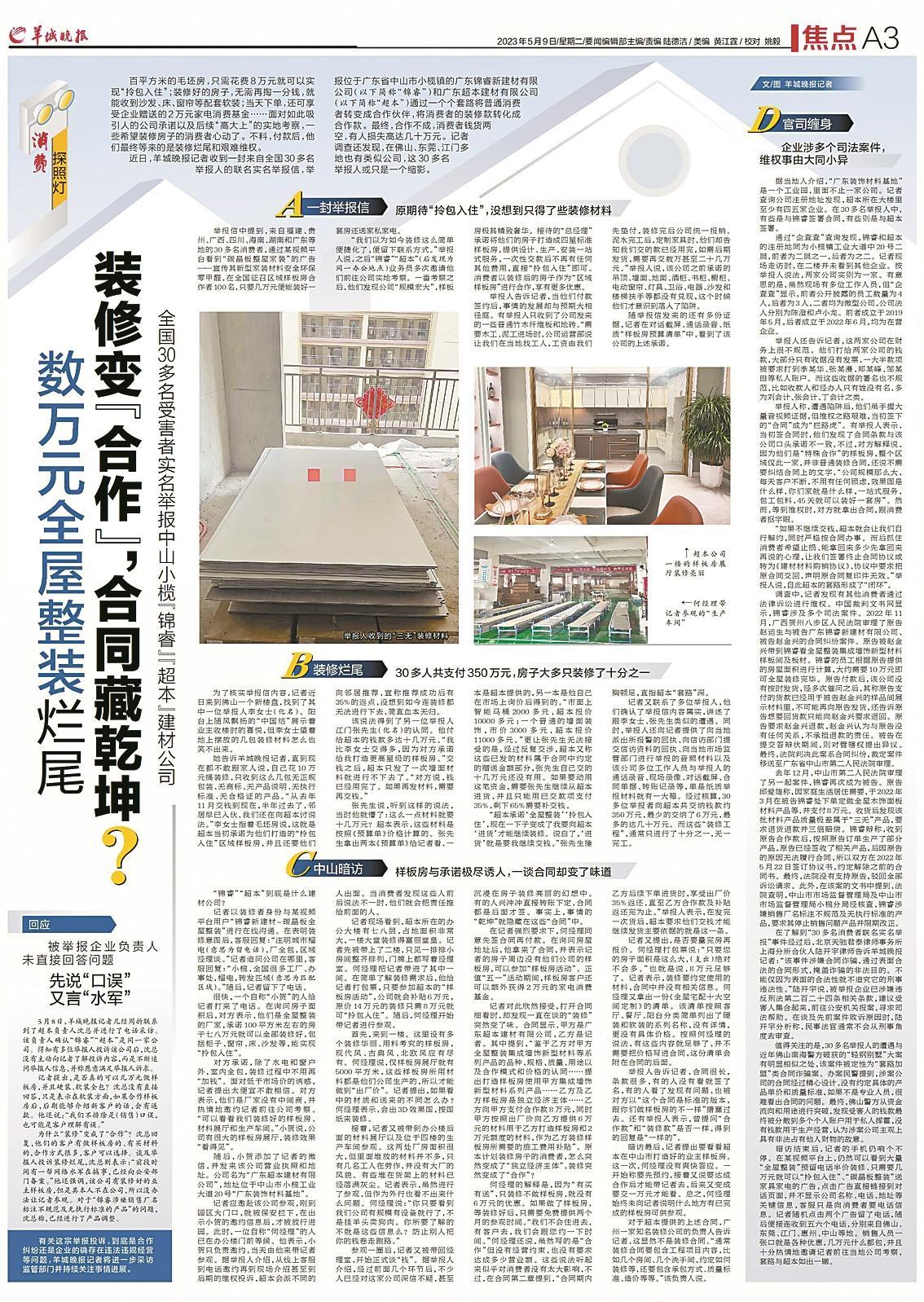 5月9日羊城晚報(bào)推出《數(shù)萬(wàn)元全屋整裝爛尾 裝修變“合作”,合同藏乾坤?全國(guó)30多名受害者實(shí)名舉報(bào)中山小欖“錦睿”“超本”建材公司》獨(dú)家報(bào)道,并作了追蹤報(bào)道。