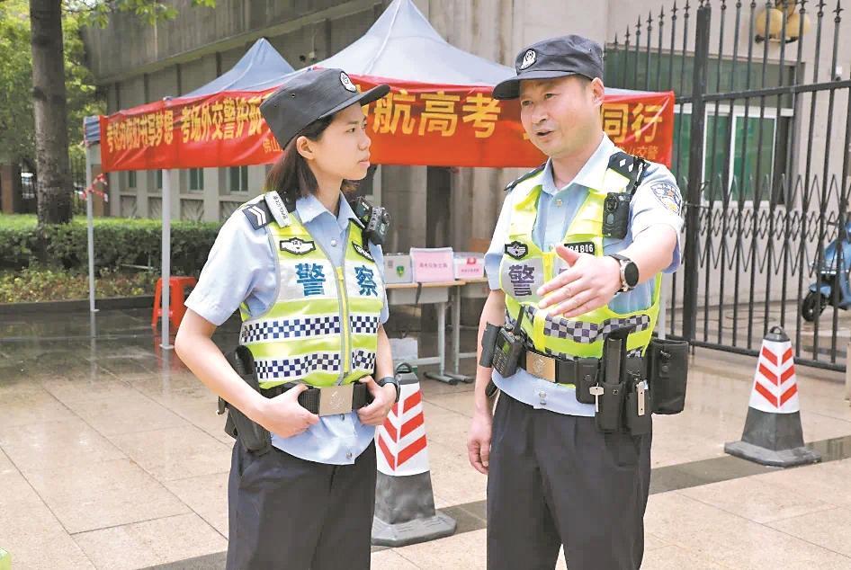 “這些高考應(yīng)急包要提前擺好”“提前拉好警戒線,錐形筒要擺好,做好人流導(dǎo)控”“要留意陪考家長的狀態(tài),天氣太熱,身體容易出現(xiàn)不適”……校門口,趙方明帶著陳芷嵐跑前跑后,傳授著護(hù)考經(jīng)驗(yàn),手上的動作也沒停著,從警務(wù)便民車上拿來高考應(yīng)急藥箱、備用包、錐形筒等一一擺好,看到有家長送考生前來,又趕緊迎上去疏導(dǎo)指揮車輛、行人有序通行,提醒家長謹(jǐn)慎小心駕駛,確保場外秩序井然。沒多久,兩人身上的警服就被汗水打濕。