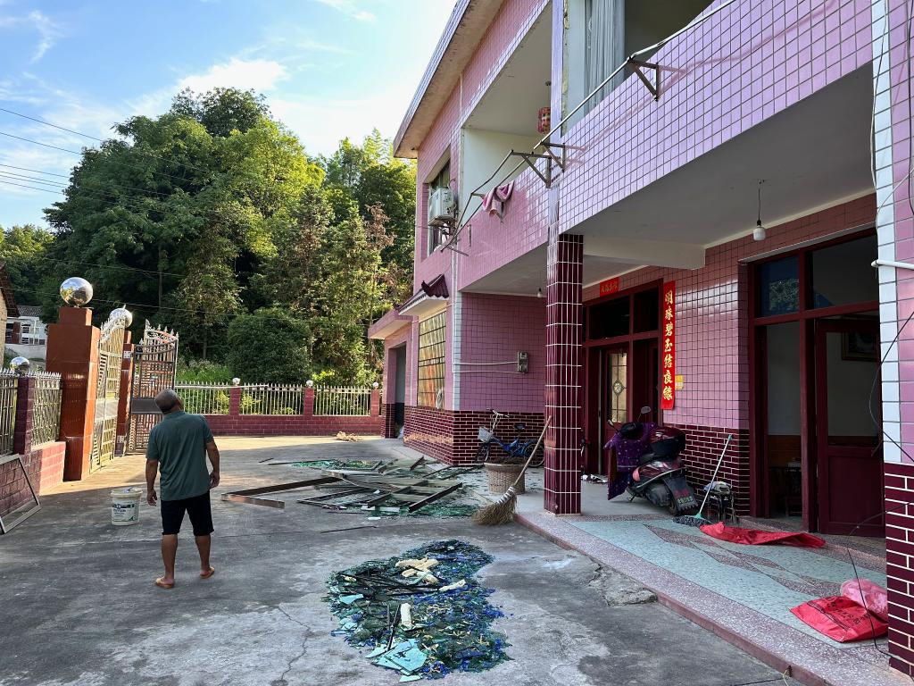 11日,村民正在清理受損的門窗。(新華社記者 謝奔 攝)