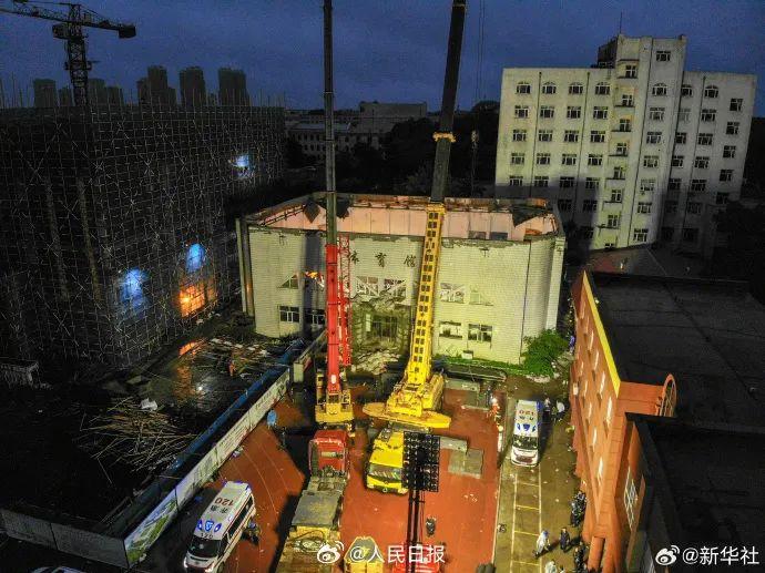 經(jīng)現(xiàn)場初步調(diào)查,與體育館毗鄰的教學綜合樓施工過程中,施工單位違規(guī)將珍珠巖堆置體育館屋頂。受降雨影響,珍珠巖浸水增重,導致屋頂荷載增大引發(fā)坍塌。深入調(diào)查仍在進行中。