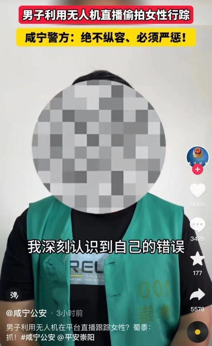 6日,咸寧市公安局網(wǎng)安大隊表示,事發(fā)咸寧崇陽,該男子汪某用無人機偷拍女性行蹤并在網(wǎng)絡直播,造成惡劣影響,涉嫌尋釁滋事,目前該男子已被查處。9月4日,汪某被處以行政拘留10日,該處罰已于當日開始執(zhí)行。