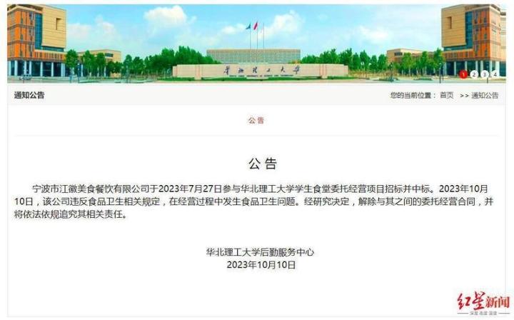 10月10日晚,華北理工大學(xué)后勤服務(wù)中心發(fā)出公告,稱寧波市江徽美食餐飲有限公司(以下簡(jiǎn)稱江徽公司)于2023年7月27日參與華北理工大學(xué)學(xué)生食堂委托經(jīng)營(yíng)項(xiàng)目招標(biāo)并中標(biāo)。2023年10月10日,該公司違反食品衛(wèi)生相關(guān)規(guī)定,在經(jīng)營(yíng)過程中發(fā)生食品衛(wèi)生問題。經(jīng)研究決定,解除與其之間的委托經(jīng)營(yíng)合同,并將依法依規(guī)追究其相關(guān)責(zé)任。
