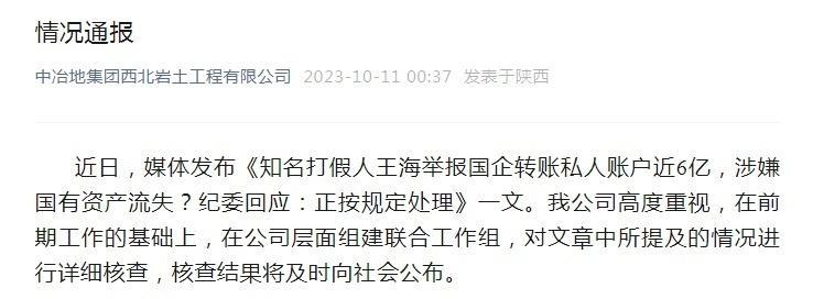 10月11日,中冶地集團(tuán)西北巖土工程有限公司微信公號發(fā)布回應(yīng):近日,媒體發(fā)布《知名打假人王海舉報國企轉(zhuǎn)賬私人賬戶近6億,涉嫌國有資產(chǎn)流失?紀(jì)委回應(yīng):正按規(guī)定處理》一文。我公司高度重視,在前期工作的基礎(chǔ)上,在公司層面組建聯(lián)合工作組,對文章中所提及的情況進(jìn)行詳細(xì)核查,核查結(jié)果將及時向社會公布。