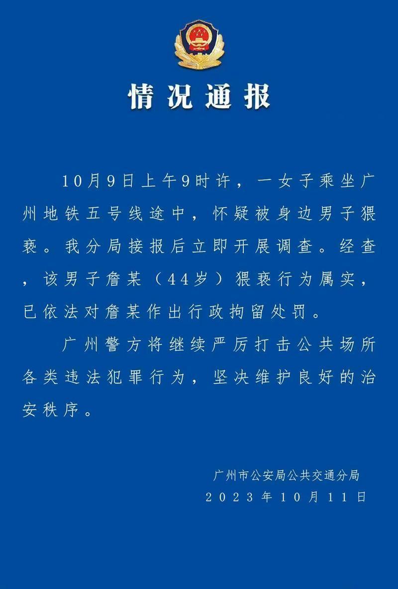 廣州公交警方10月11日下午通報(bào),10月9日上午9時(shí)許,一女子乘坐廣州地鐵五號(hào)線途中,懷疑被身邊男子猥褻。我分局接報(bào)后立即開展調(diào)查。經(jīng)查,該男子詹某(44歲)猥褻行為屬實(shí),已依法對詹某作出行政拘留處罰。廣州警方將繼續(xù)嚴(yán)厲打擊公共場所各類違法犯罪行為,堅(jiān)決維護(hù)良好的治安秩序。