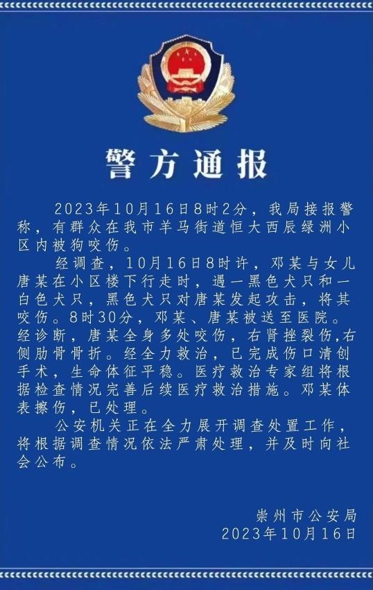經(jīng)調查,10月16日8時許,鄧某與女兒唐某在小區(qū)樓下行走時,遇一黑色犬只和一白色犬只,黑色犬只對唐某發(fā)起攻擊,將其咬傷。8時30分,鄧某、唐某被送至醫(yī)院。經(jīng)診斷,唐某全身多處咬傷,右腎挫裂傷,右側肋骨骨折。經(jīng)全力救治,已完成傷口清創(chuàng)手術,生命體征平穩(wěn)。醫(yī)療救治專家組將根據(jù)檢查情況完善后續(xù)醫(yī)療救治措施。鄧某體表擦傷,已處理。