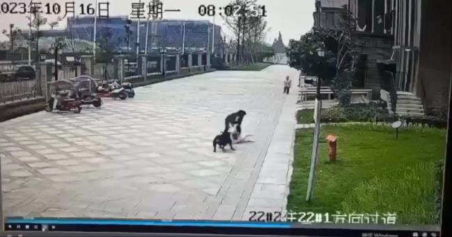 網(wǎng)絡(luò)上一段時(shí)長(zhǎng)2分7秒的監(jiān)控視頻顯示,16日8時(shí)許,在成都崇州市恒大西辰綠洲小區(qū)一棟建筑物底下,一只黑色犬只不停地徘徊、逗留,走動(dòng)約1分鐘。8時(shí)2分35秒,母親鄧某牽著唐某走出大樓,黑色犬立刻圍了上來(lái),并對(duì)唐某展開(kāi)撕咬,并將其拖至草坪,約40多秒。