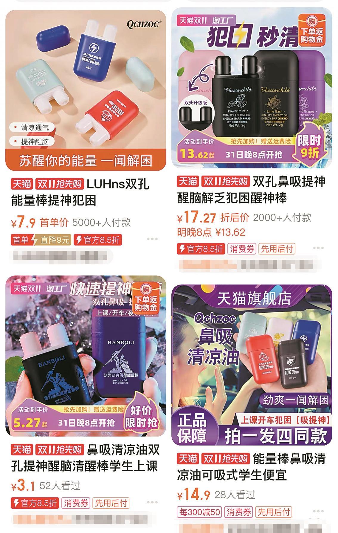 記者在電商平臺搜索發(fā)現(xiàn),不少線上商家在售賣這種“鼻吸能量棒”,價格多在幾元至幾十元之間,部分產(chǎn)品月銷量達上千件。從商家宣傳看,產(chǎn)品主要由薄荷腦、冰片、植物精油等成分構(gòu)成,氣味多樣,有些產(chǎn)品還加入了烈酒成分,以吸引消費者購買。