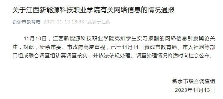 通報(bào)稱,11月10日,“江西新能源科技職業(yè)學(xué)院克扣學(xué)生實(shí)習(xí)報(bào)酬”的網(wǎng)絡(luò)信息引發(fā)輿論關(guān)注,對(duì)此,新余市委、市政府高度重視,已于11月11日責(zé)成市教育局、市人社局等部門組成聯(lián)合調(diào)查組認(rèn)真調(diào)查核實(shí),并依法依規(guī)處理。調(diào)查處理情況將適時(shí)向社會(huì)公布。