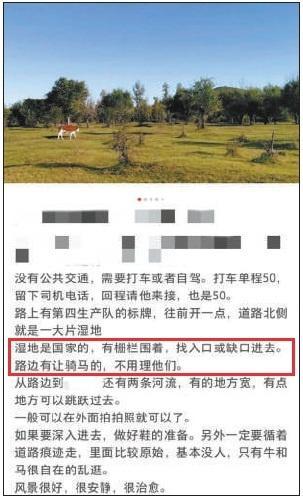 “坐半天車就只能看到一個(gè)全景,票還老貴”。在不少勸退、避雷該景區(qū)的網(wǎng)帖中,小露看到了其他網(wǎng)友發(fā)布的“免費(fèi)濕地景觀”旅游攻略帖,“有一個(gè)免費(fèi)看濕地的地方,在第四生產(chǎn)隊(duì),里面比較原始,基本沒人,很治愈”。在參考多篇攻略帖的建議后,小露決定規(guī)避上述正規(guī)濕地景區(qū),去“更美、免費(fèi)”的野濕地。