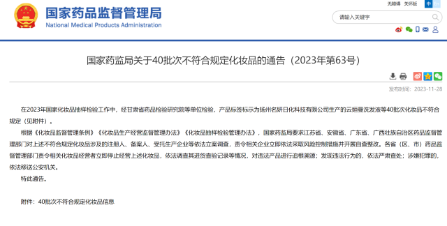 本周,國家藥監(jiān)局官網(wǎng)發(fā)布2023年第63號化妝品抽檢通告,有40批次不合格化妝品被檢出成分異樣。從通告信息來看,涉事化妝品當(dāng)中洗護(hù)發(fā)產(chǎn)品占比超一半,為26批次,其中20批次來自廣東。
