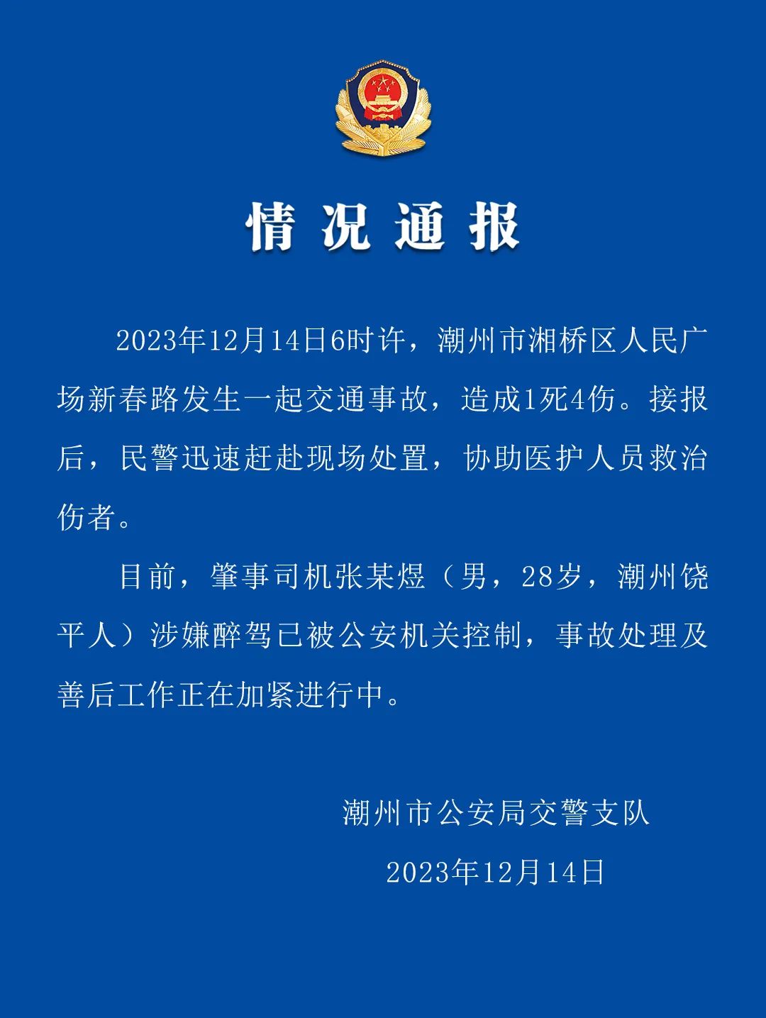 據(jù)通報稱,14日6時許,潮州市湘橋區(qū)人民廣場新春路發(fā)生一起交通事故,造成1死4傷。接報后,民警迅速趕赴現(xiàn)場處置,協(xié)助醫(yī)護人員救治傷者。