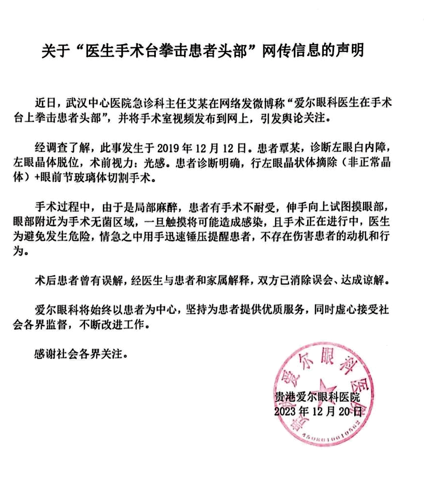 對此,貴港愛爾眼科21日凌晨在微信公眾號發(fā)聲明回應稱:經(jīng)調(diào)查了解,此事發(fā)生于2019年12月12日。患者覃某,診斷左眼白內(nèi)障,左眼晶體脫位,在行左眼晶狀體摘除(非正常晶體)+眼前節(jié)玻璃體切割手術過程中,由于是局部麻醉,患者有手術不耐受,伸手向上試圖摸眼部,眼部附近為手術無菌區(qū)域,一旦觸摸將可能造成感染,且手術正在進行中,醫(yī)生為避免發(fā)生危險,情急之中用手迅速錘壓提醒患者,不存在傷害患者的動機和行為。