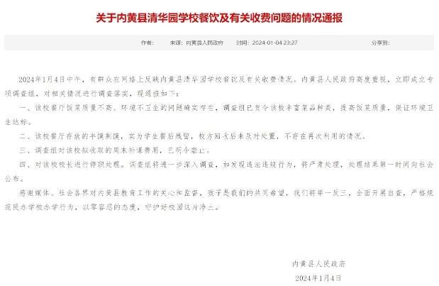 2024年1月4日中午,有群眾在網(wǎng)絡(luò)上反映內(nèi)黃縣清華園學校餐飲及有關(guān)收費情況。內(nèi)黃縣人民政府高度重視,立即成立專項調(diào)查組,對相關(guān)情況進行調(diào)查落實,現(xiàn)通報如下: