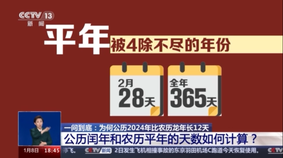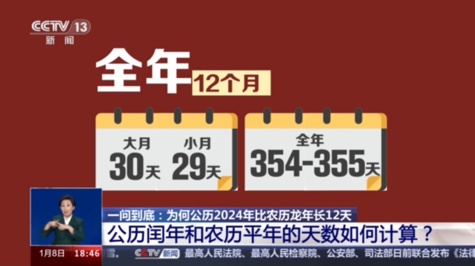 中國(guó)科學(xué)院紫金山天文臺(tái)發(fā)布的日歷資料顯示,公歷2024年為閏年,2月有29天,全年共有366天,而即將到來的農(nóng)歷甲辰年(龍年)則是平年,全年共有354天。為什么公歷2024年比農(nóng)歷龍年多出了12天?