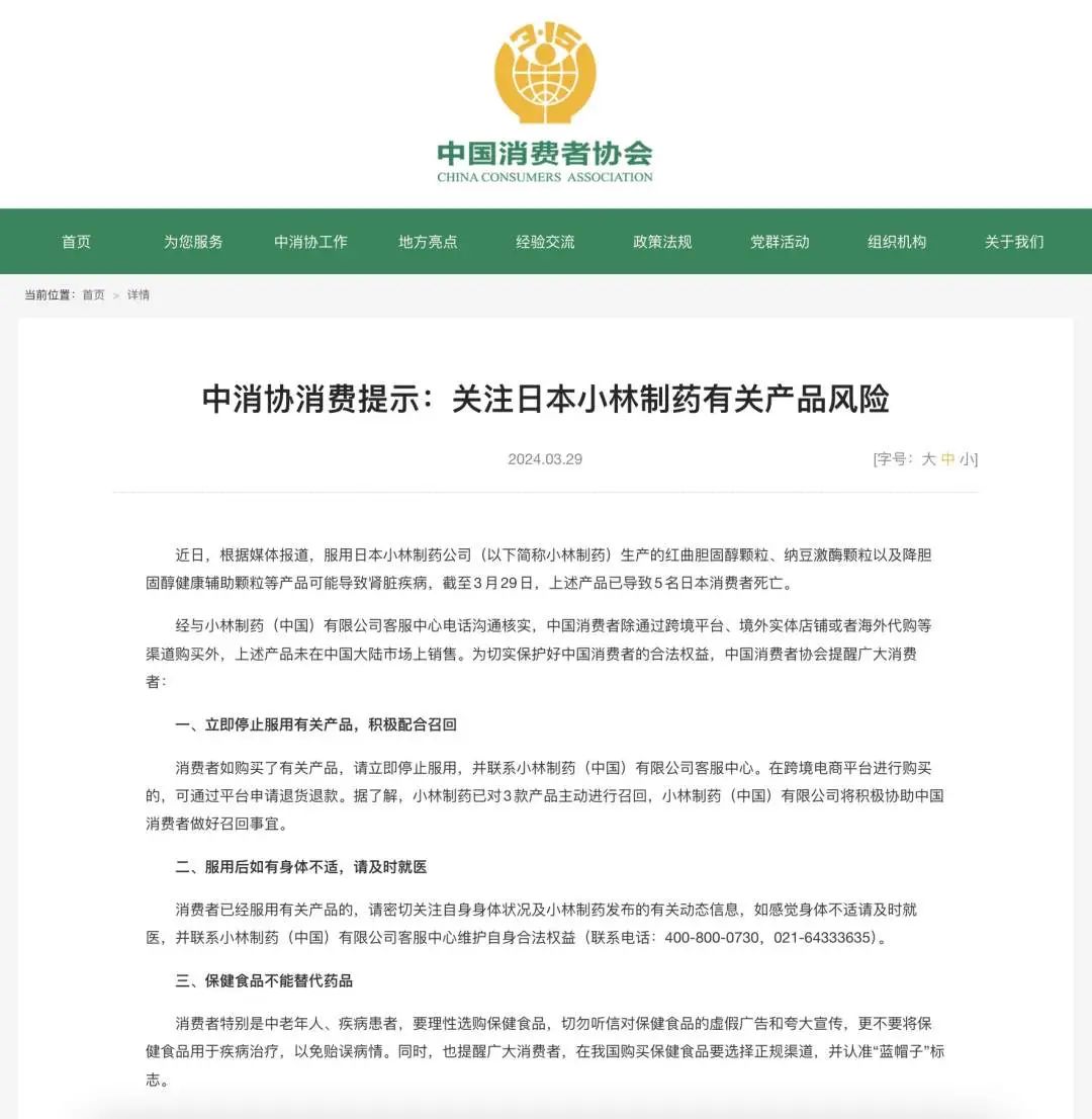 近日,根據(jù)媒體報(bào)道,服用日本小林制藥公司(以下簡(jiǎn)稱小林制藥)生產(chǎn)的紅曲膽固醇顆粒、納豆激酶顆粒以及降膽固醇健康輔助顆粒等產(chǎn)品可能導(dǎo)致腎臟疾病,截至3月29日,上述產(chǎn)品已導(dǎo)致5名日本消費(fèi)者死亡。