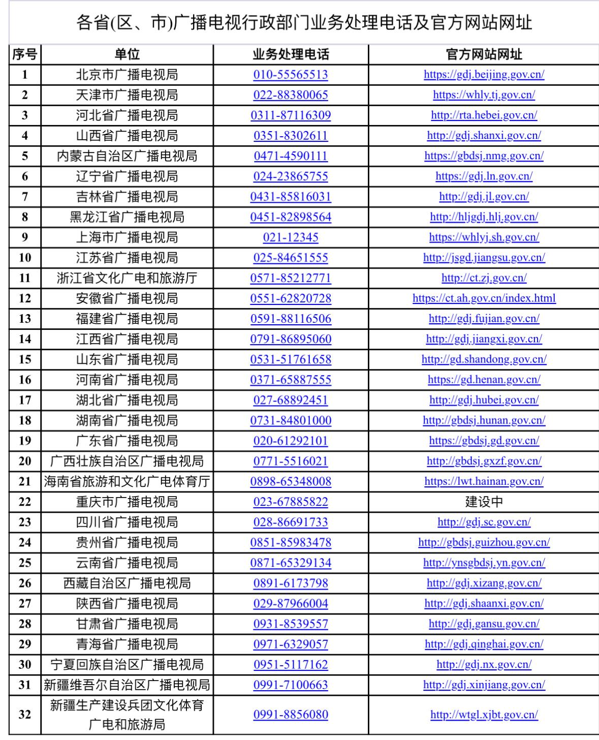1.所在省(區(qū)、市)廣播電視行政部門業(yè)務(wù)處理電話,以及官方網(wǎng)站等線上渠道(見附表);