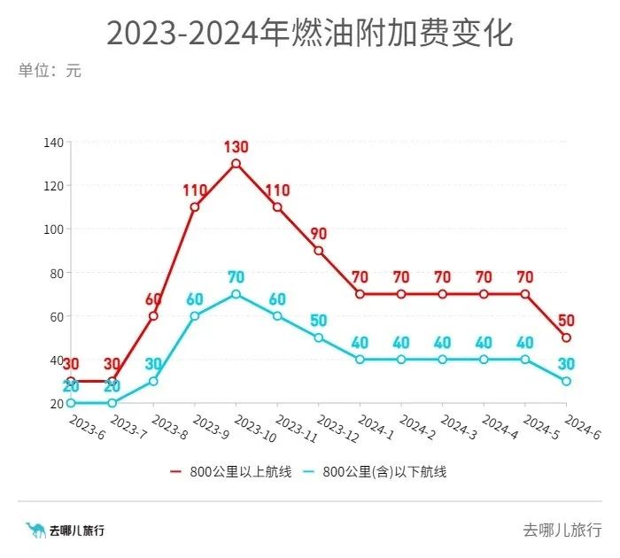 此外,5月29日,去哪兒也接到河北航空消息:自2024年6月5日(出票日期)起,成人旅客:800公里以上航線每位旅客收取50元燃油附加費,800公里(含)以下航線每位旅客收取30元燃油附加費。相較于調整前分別降低了20元和10元。燃油附加費降低,有助于減少端午出游成本。