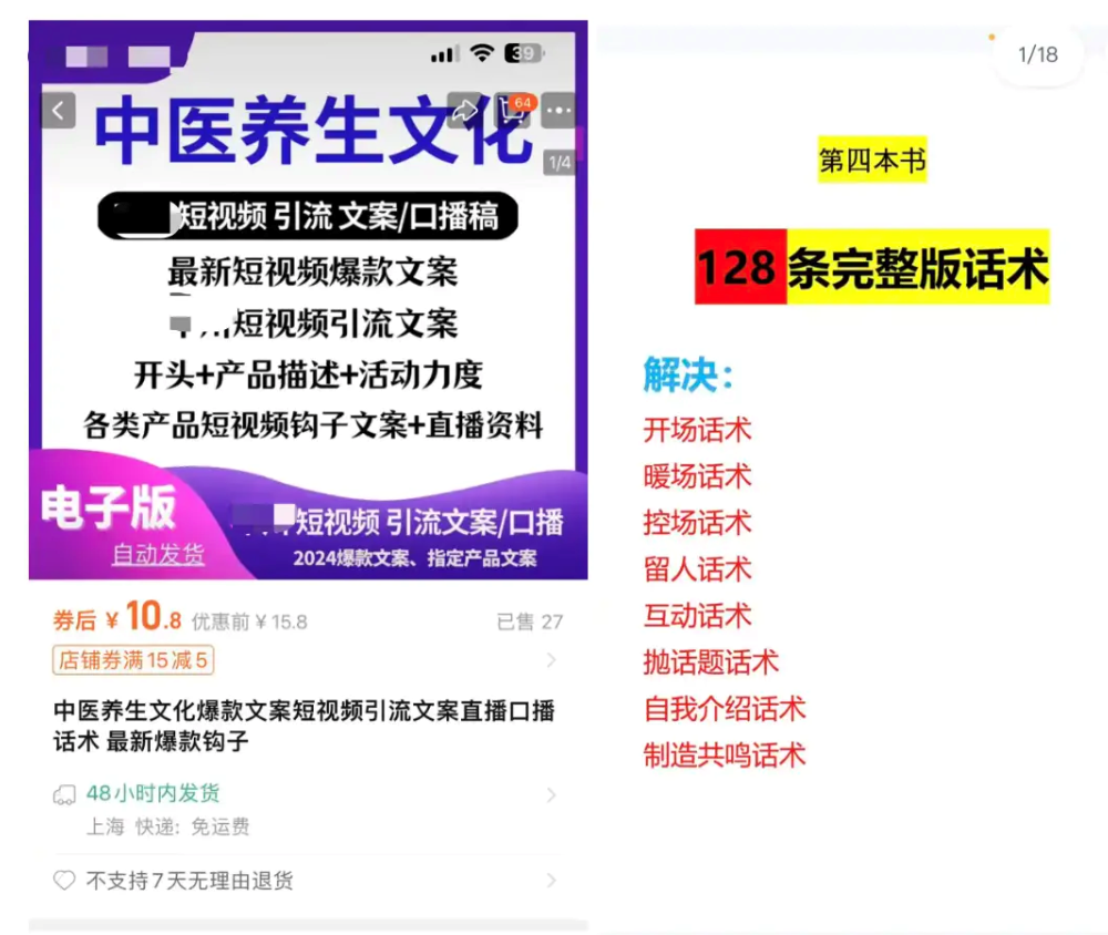 記者在某網(wǎng)購平臺上檢索發(fā)現(xiàn),有商家售賣“大健康爆款文案短視頻引流文案”,價(jià)格8元至29元不等。其中包含100多種健康類網(wǎng)絡(luò)直播話術(shù),包括互動話術(shù)、拋話題話術(shù)、制造共鳴話術(shù)等。