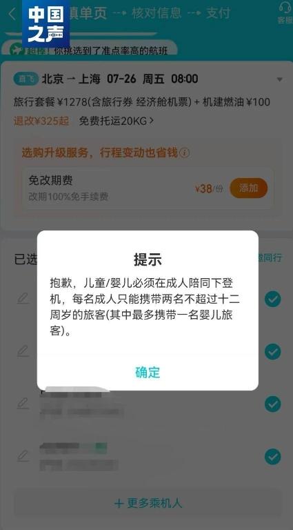 記者在某在線票務(wù)平臺機票預(yù)訂頁面添加1名成人旅客和3名兒童時,平臺跳出了“每名成人只能攜帶兩名不超過十二周歲的旅客(其中最多攜帶一名嬰兒旅客)”的彈窗提示。而這趟航班由國航運營,按照規(guī)定,可以攜帶3名5歲以下兒童乘機。