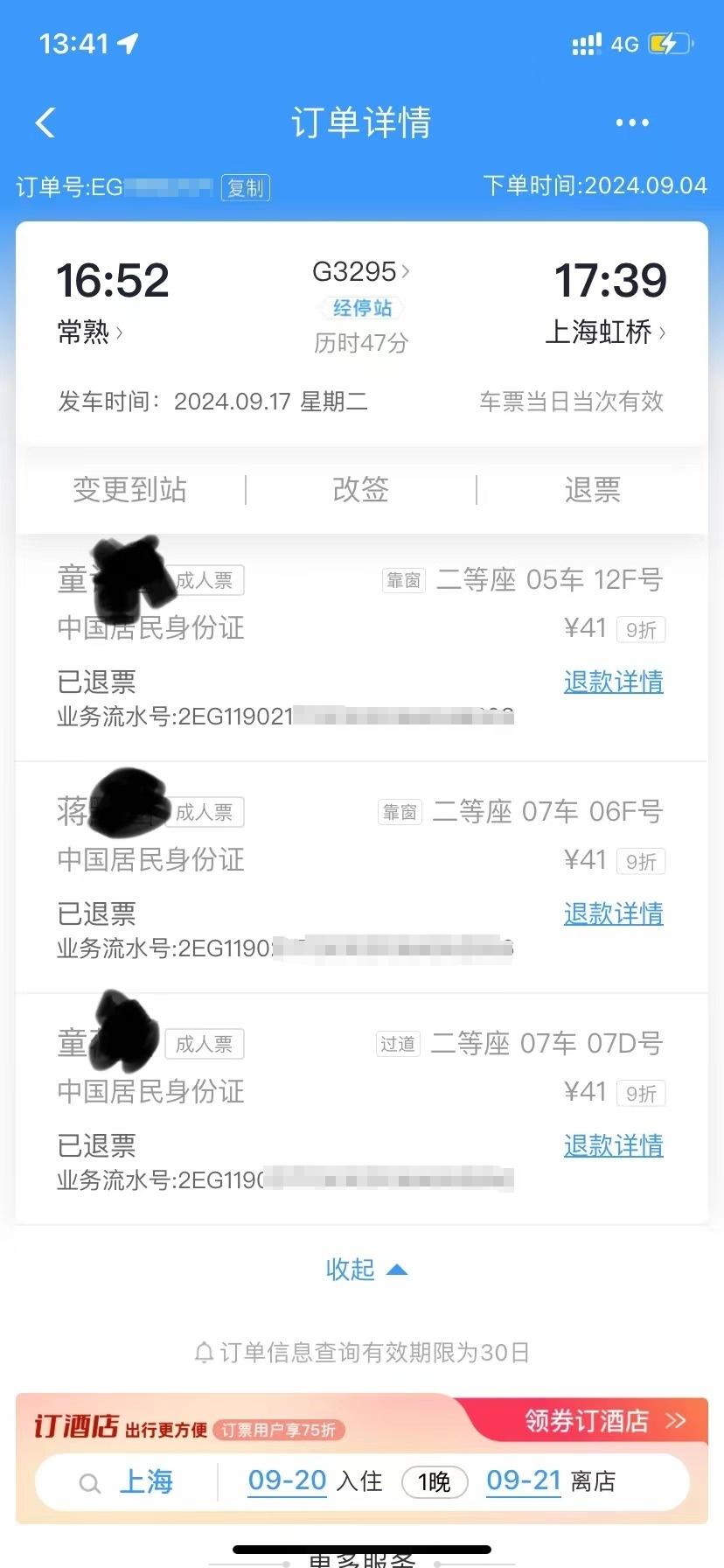 之后,童先生分別打了12345和12306詢問退票費(fèi)事宜。他表示:“9月16日當(dāng)天我就打了12345反映問題,中秋節(jié)最后一天我又打通了12306的客服熱線,他們就跟我解釋因?yàn)槲沂窍挛?點(diǎn)多到常熟的高鐵,第二天下午4點(diǎn)多從常熟返回上海,超過了24小時(shí),不在聯(lián)程車票可以免費(fèi)退票的規(guī)則里要收手續(xù)費(fèi)。因?yàn)榕_(tái)風(fēng)不可抗力,我希望他們以建議的形式反映給上面,管理部門可以研究一下這個(gè)事情,對(duì)于這種不可抗力應(yīng)該會(huì)有特殊的規(guī)定。如果是我個(gè)人的原因取消車次收退票費(fèi)是非常合理的,前序的服務(wù)沒有執(zhí)行,我只能是迫不得已才取消。”
