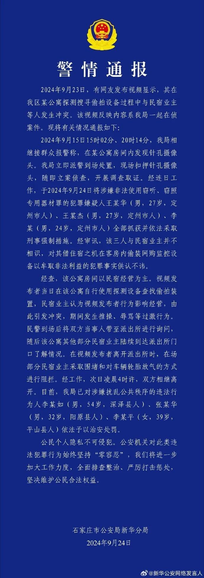 9月24日,石家莊市公安局新華分局發(fā)布警情通報(bào),于2024年9月24日將涉嫌非法使用竊聽(tīng)、竊照專(zhuān)用器材罪的犯罪嫌疑人王某華(男,27歲,定州市人)、王某杰(男,27歲,定州市人)、李某(男,24歲,定州市人)全部抓獲并依法采取刑事強(qiáng)制措施。