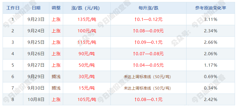 7日晚國際油價繼續(xù)大漲,布倫特原油和美油雙雙大漲近4個百分點,連續(xù)5天大漲,完全漲瘋了。從9月23日周期統(tǒng)計開始至今,原油變化率經(jīng)歷了多次波動。最初,第1個工作日時,參考原油變化率為3.11%,預計汽柴油上調(diào)135元/噸,折算后每升油價上漲約0.1—0.12元。隨后幾日,變化率有所回調(diào),但整體仍保持在上調(diào)預期內(nèi)。特別是在國慶假期期間,受國際油價大幅上漲的影響,油價上調(diào)預期再度增強。