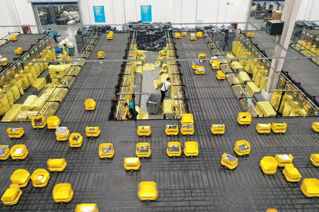 11月7日,浙江省湖州市德清縣乾元鎮(zhèn)第一產(chǎn)業(yè)智慧物流園區(qū)快魚服飾有限公司華東物流中心,800余臺(tái)分揀“小黃人”機(jī)器人在精準(zhǔn)配送各類服飾(無(wú)人機(jī)照片)。新華社發(fā)(倪立芳攝)