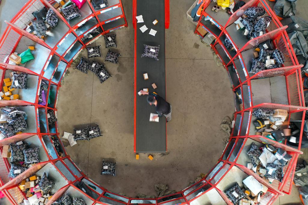 11月6日,工作人員在山東省寧陽(yáng)縣菜鳥(niǎo)智慧物流園內(nèi)分揀快遞商品(無(wú)人機(jī)照片)。新華社記者 朱崢 攝