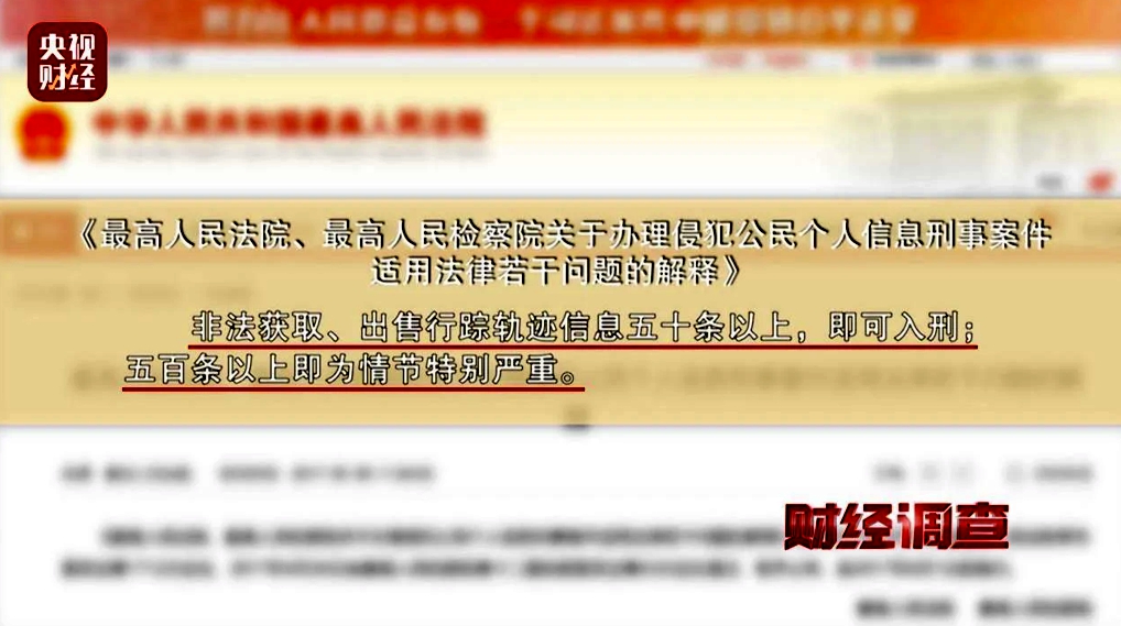 2017年《最高人民法院、最高人民檢察院關(guān)于辦理侵犯公民個(gè)人信息刑事案件適用法律若干問題的解釋》中規(guī)定:非法獲取、出售行蹤軌跡信息五十條以上,即可入刑;五百條以上即為情節(jié)特別嚴(yán)重。