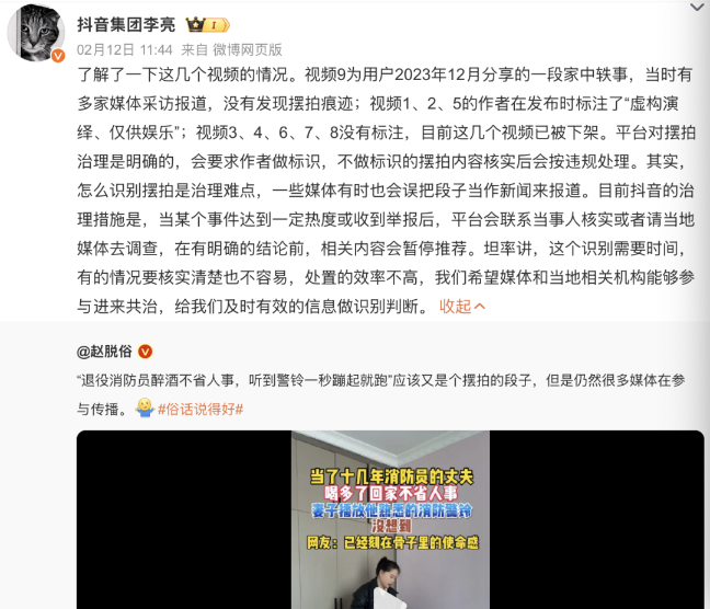 2月12日,抖音集團(tuán)副總裁李亮在微博發(fā)文談及視頻“擺拍”亂象。他表示,平臺(tái)對(duì)擺拍治理是明確的,會(huì)要求作者做標(biāo)識(shí),不做標(biāo)識(shí)的擺拍內(nèi)容核實(shí)后會(huì)按違規(guī)處理。“怎么識(shí)別擺拍是治理難點(diǎn),一些媒體有時(shí)也會(huì)誤把段子當(dāng)作新聞來報(bào)道。目前抖音的治理措施是,當(dāng)某個(gè)事件達(dá)到一定熱度或收到舉報(bào)后,平臺(tái)會(huì)聯(lián)系當(dāng)事人核實(shí)或者請(qǐng)當(dāng)?shù)孛襟w去調(diào)查,在有明確的結(jié)論前,相關(guān)內(nèi)容會(huì)暫停推薦。”