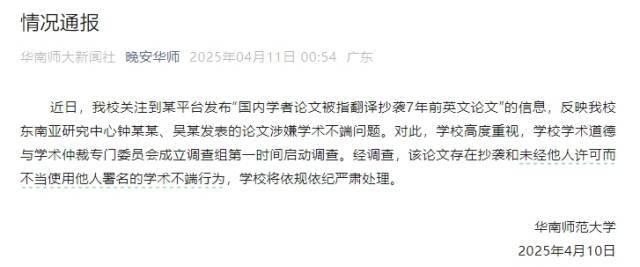 4月11日凌晨,華南師范大學官方微信發(fā)布通報,全文如下: