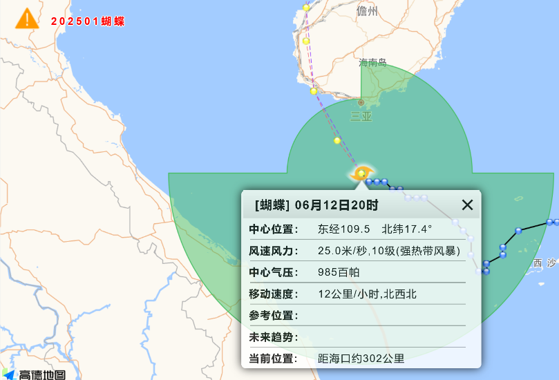 記者從海南省氣象部門了解到,今年第1號臺風(fēng)“蝴蝶”已于12日20時由熱帶風(fēng)暴級加強(qiáng)為強(qiáng)熱帶風(fēng)暴級,其中心位于北緯17.4度、東經(jīng)109.5度,也就是在海南省三亞市偏南方向約95公里的南海中西部海面上,距離海口市303公里,中心附近最大風(fēng)力10級(25米/秒),中心最低氣壓為985百帕,七級風(fēng)圈半徑100-260公里。