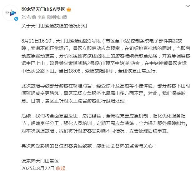 湖南張家界天門山景區(qū)8月22日發(fā)布關(guān)于天門山索道故障的情況說明: