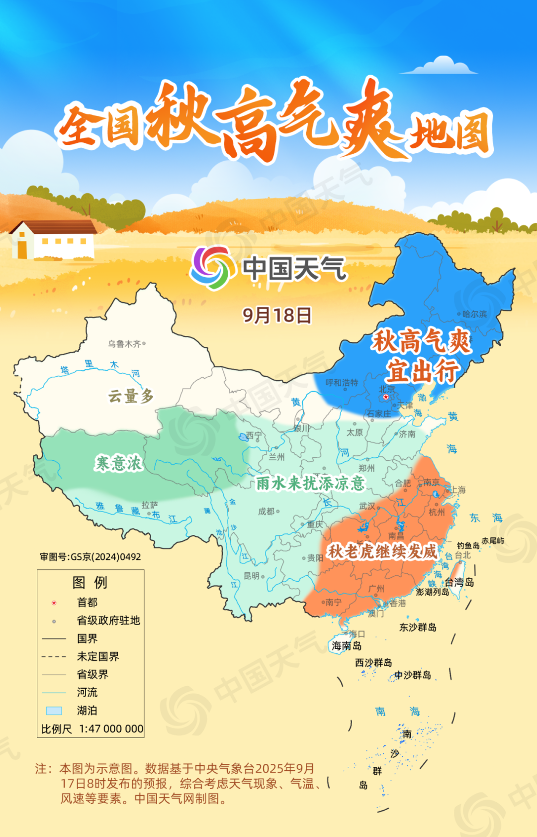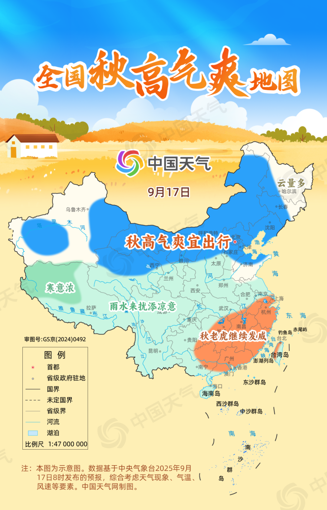 17日,北方多地天空放晴,風(fēng)力不大,云淡風(fēng)輕。東北地區(qū)、華北北部、西北地區(qū)東部等地屬于秋高氣爽的區(qū)域,這些地方以晴天為主,最高氣溫將在20℃至25℃左右,陽(yáng)光在線,氣溫舒適,體感舒爽,正是出游好天氣。但在華西及長(zhǎng)江沿線將有雨水來(lái)擾,特別是陜西、四川盆地等地的華西秋雨正盛,部分地區(qū)可能出現(xiàn)大到暴雨,外出需帶好雨具,注意交通安全。同時(shí),江南多地秋老虎依舊兇猛,江西、湖南等地還將有成片高溫,需持續(xù)做好防暑降溫措施。