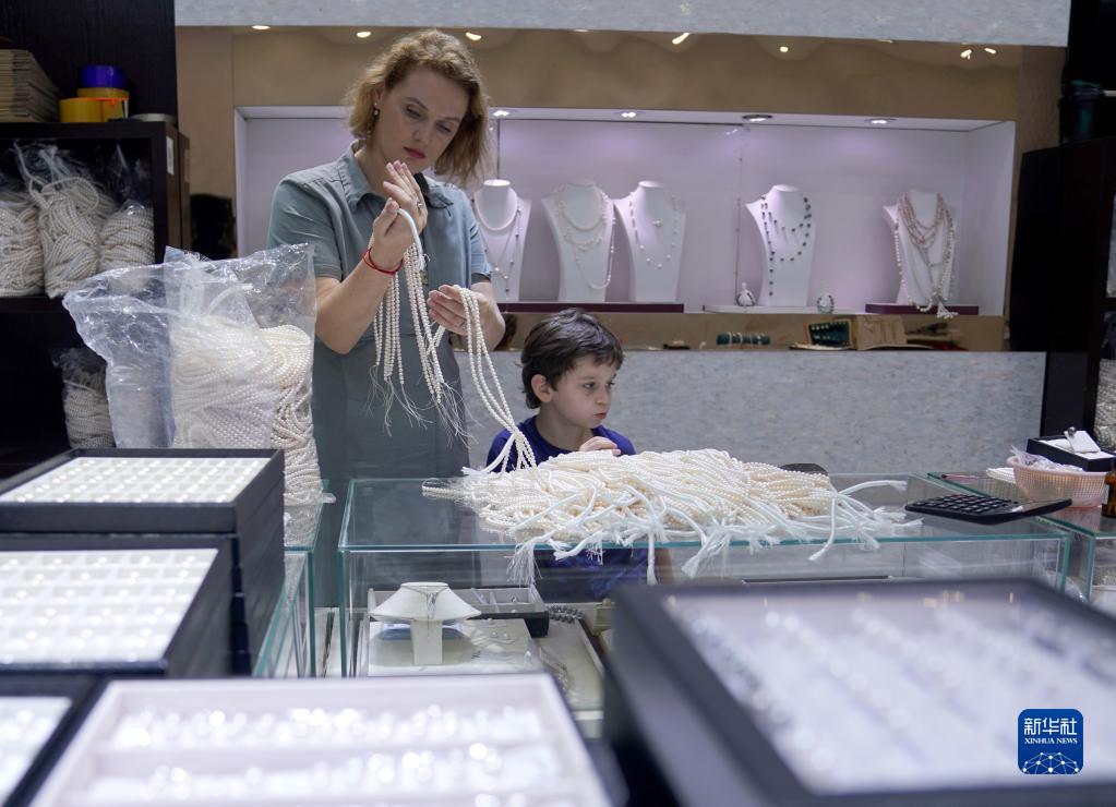 5月17日,浙江省諸暨市山下湖鎮(zhèn)華東國際珠寶城,一名來自俄羅斯的批發(fā)商選購珍珠項(xiàng)鏈。